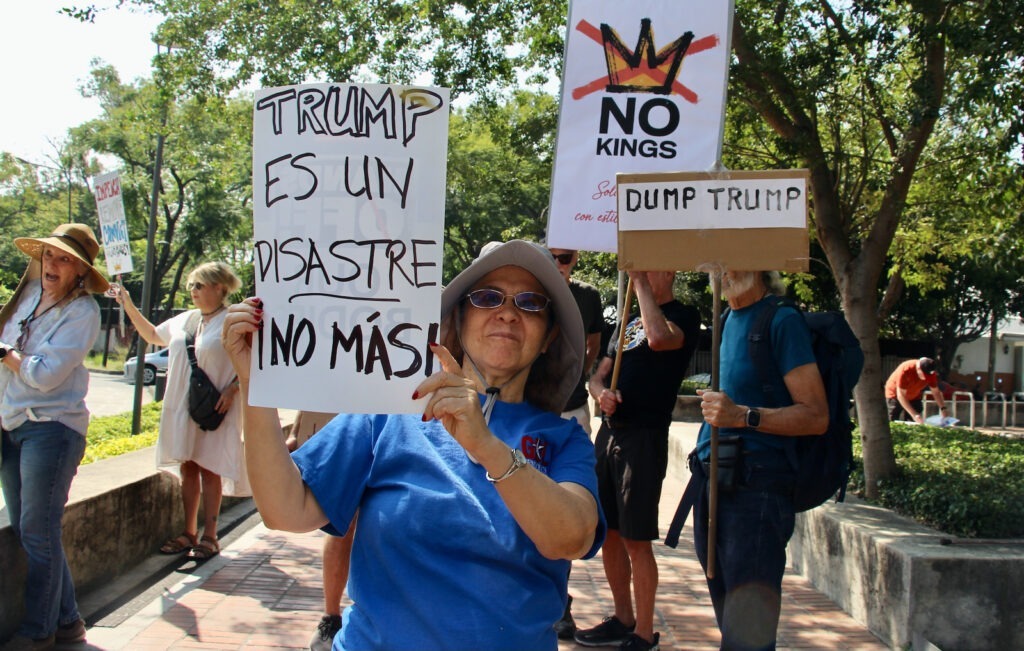 Era una mañana soleada de sábado en la tranquila glorieta frente al Consulado de Estados Unidos en Guadalajara. Los conductores bajaban la velocidad para leer los carteles pintados a mano — No Tyrants (No a los tiranos), Resist (Resiste), Only You Can Prevent Fascist Liars (Solo tú puedes prevenir a los mentirosos fascistas). Algunos tocaban el claxon en señal de apoyo; uno levantó el pulgar. Desde el camellón, un pequeño grupo de jardineros mexicanos hizo una pausa en su trabajo para aplaudir, coreando el grito que se propagaba por la plaza: