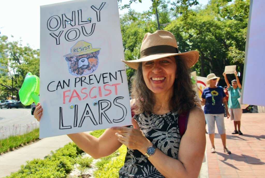 Su cartel, hecho a mano y con el tema de Smokey Bear, decía: “Only You Can Prevent Fascist Liars”.