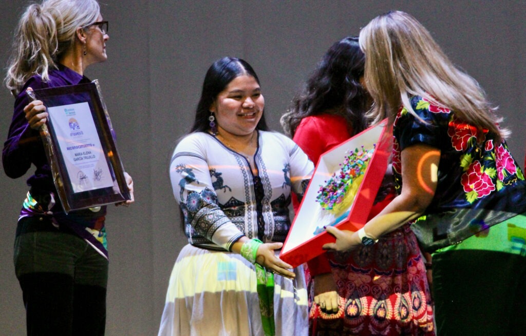 Las tres ganadoras indígenas presentes en la ceremonia de premiación, de izquierda a derecha: Tuutu Geraldine Rivera Carrillo, Marissa Velázquez Ramírez y Leticia Robles González. (Tracy L. Barnett)