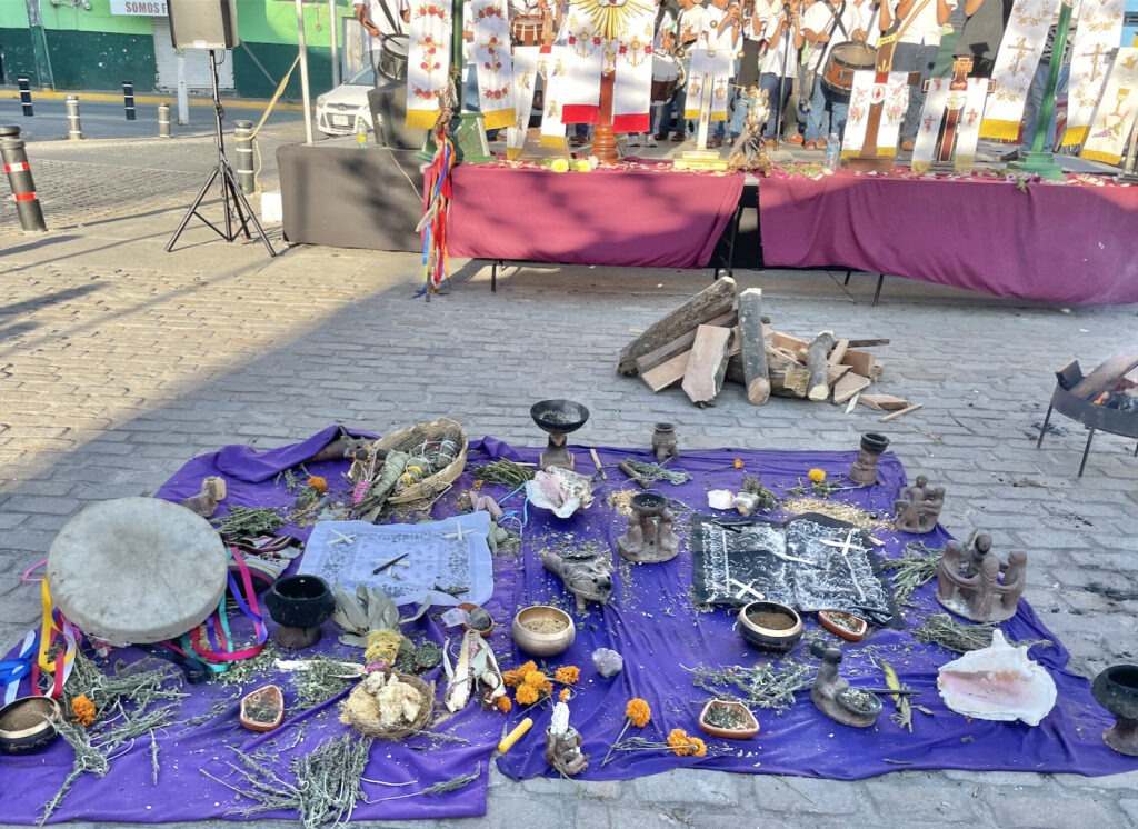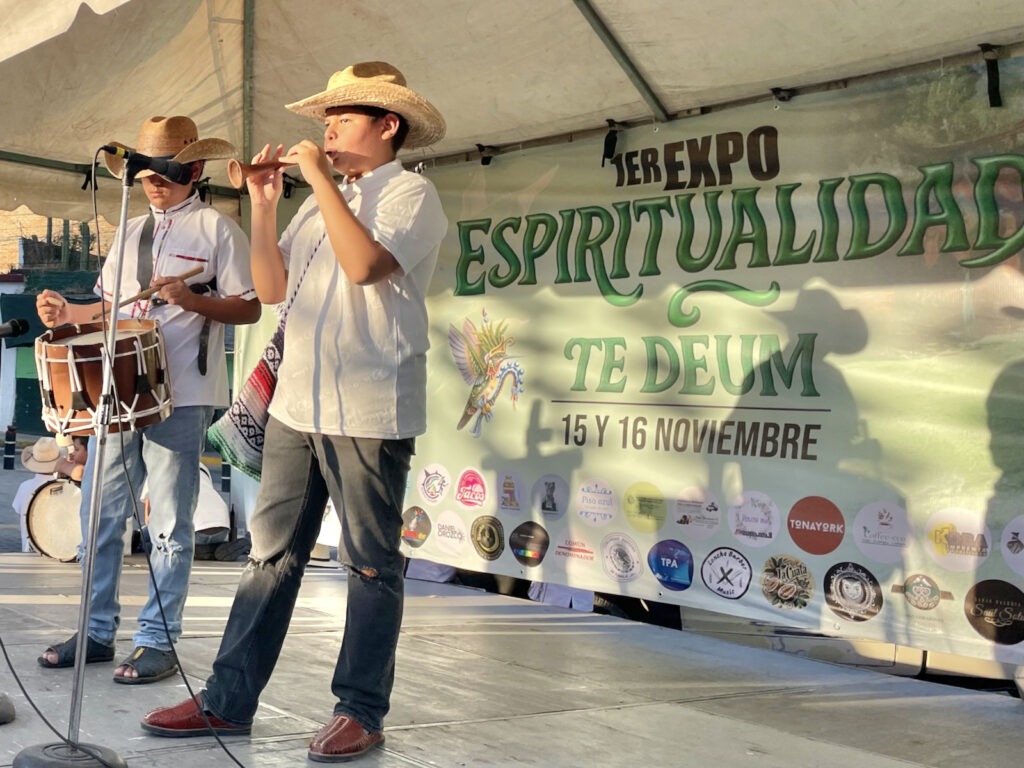 Cuando el sol empezaba a descender sobre el Paseo de los Guardianes de la Reina, en Tonalá, el aroma del copal se suspendía en el aire como una oración. Sobre el empedrado, bajo las esculturas de los guardianes y con la mirada del Cerro de la Reina a la distancia, un grupo de danzantes con manta blanca y fajillas rojas y verdes acomodó un tlamanalli —un altar de flores, semillas, hierbas y copal colocado directamente sobre la tierra— sobre un paño morado. Mientras giraban alrededor de la ofrenda, el ritmo grave del huehuetl y el llamado agudo del atecocolli se mezclaron con las voces de los abuelos y abuelas invocando a los cuatro rumbos. Así comenzó la Primera Expo de Espiritualidad Te Deum, un encuentro de dos días que tejió vestimentas y cruces católicas con deidades ancestrales y elementos sagrados.
