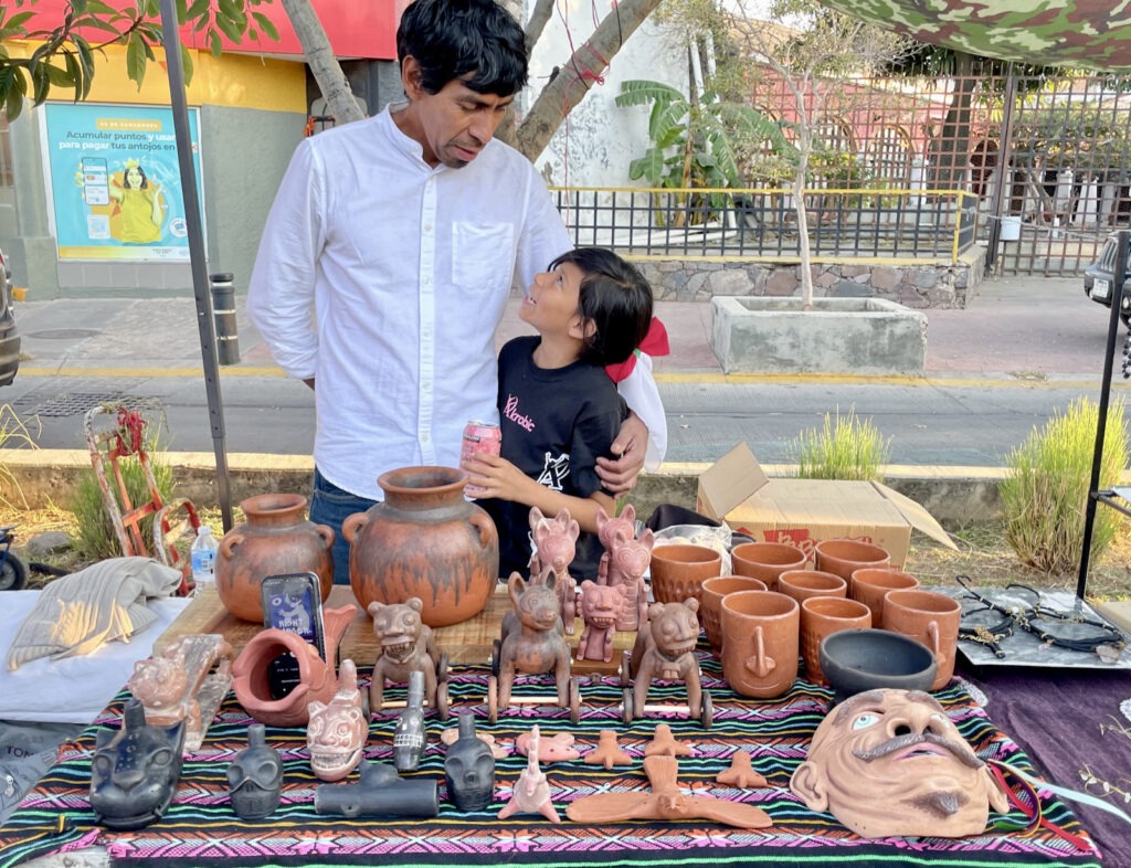 Más allá de los rezos, la expo también fue un escaparate del patrimonio artístico de Tonalá. A lo largo del paseo se extendió una feria de barro bruñido, barro Greta, máscaras de Tastoán y silbatos en forma de animales. En el escenario, las cruces decoradas con paños bordados se entremezclaban con figuras de serpientes y soles. Los niños se tomaban fotos entre las esculturas gigantes de guardianes, asomando sus rostros a través de máscaras de jaguar de barro.