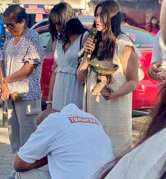 Sandi Bell, la mujer que soñó y organizó la expo, observaba con lágrimas en los ojos. “Simboliza nuestra unión,” explicó más tarde, sentada a un costado mientras una banda de chirimía se presentaba. Bell se describe como “instrumento de Dios” y “guardiana espiritual de esta tierra sagrada y bendita que es Tonalá”, y concibió el evento después de tres años de oración y meditación. La yuxtaposición de cruces y símbolos prehispánicos fue, dice, un acto deliberado de sanación.