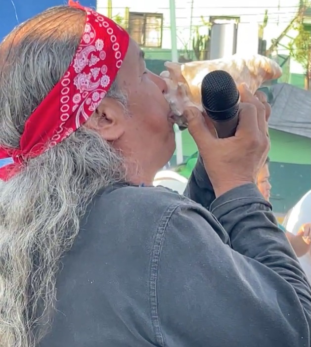 Luego tomó la palabra Yaomitl, temazcalero del Temazcal Los Colibríes, con un paliacate rojo en la cabeza. Levantó una concha marina a sus labios y sopló un sonido estremecedor. Después habló sobre la Madre Tierra.