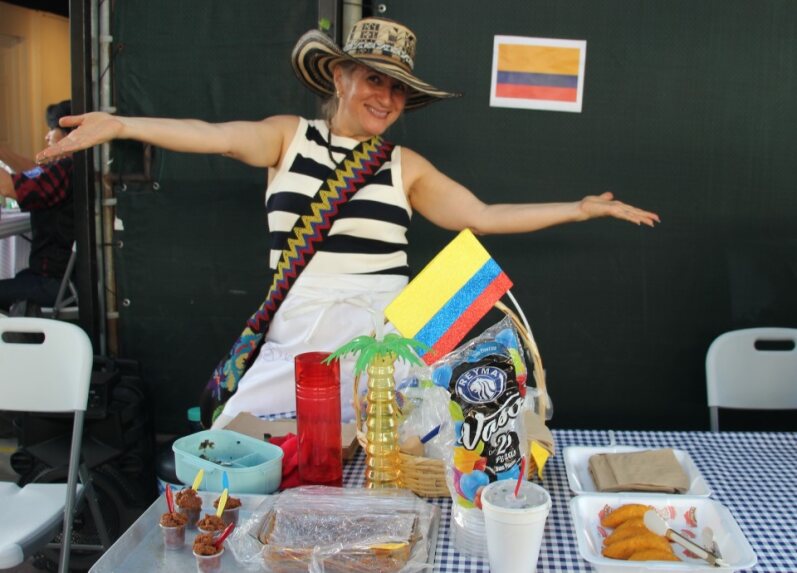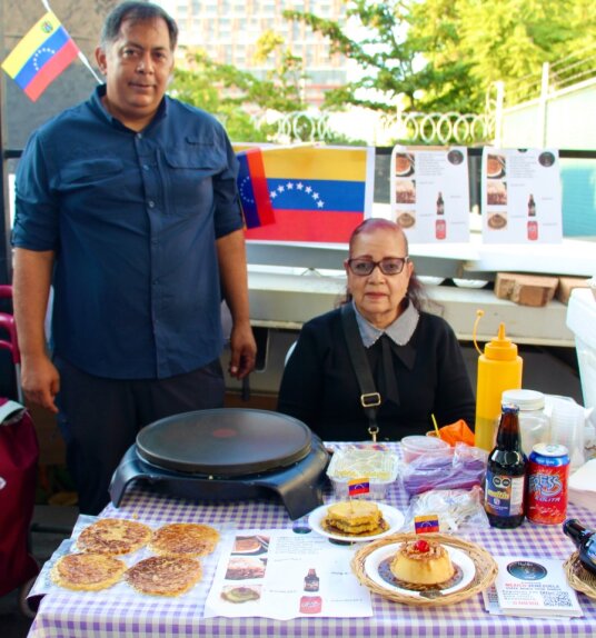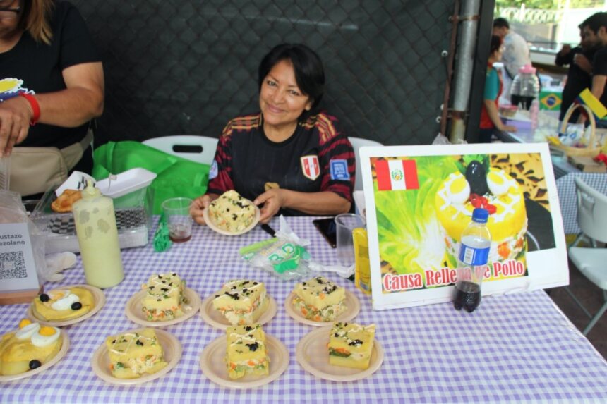 En uno de los puestos, Nélida Vásquez, de Perú, servía cremosas papas a la huancaína y una brillante causa rellena, mientras Karina y Héctor, de Venezuela, doraban humeantes cachapas sobre el comal. Cerca de allí, la abogada ambiental colombiana María Patricia Jiménez Fernández sonreía detrás de una mesa repleta de empanadas doradas y bandejas de dulces de coco, típicos de su natal Cartagena.