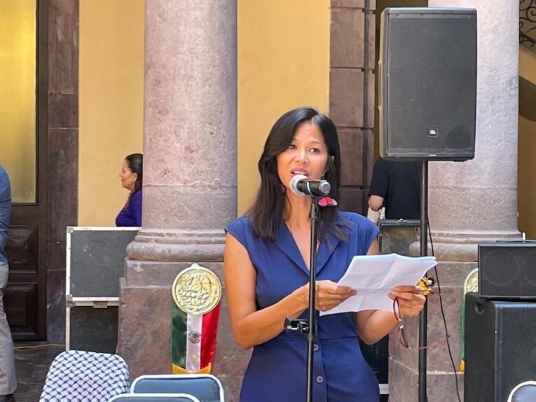 Tran Dang, fundadora del Centro Rizoma para Migrantes, habla en la 3ra Feria Gastronómica y Cultural en Guadalajara. “Creo que cuando vivimos en un mundo cada vez menos humano, debemos ser cada vez más humanos”, dijo ante la American Society of Jalisco a principios de este mes. (Foto de Tracy L. Barnett)